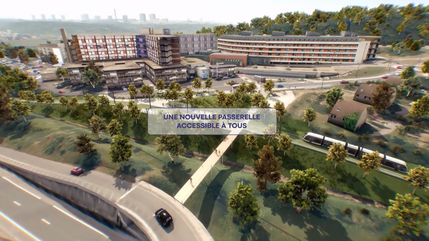 À terme, une nouvelle passerelle piétonne remplacera les aménagements provisoires. Elle reliera directement l’hôpital Jacques Monod à la zone commerciale de la Lézarde.